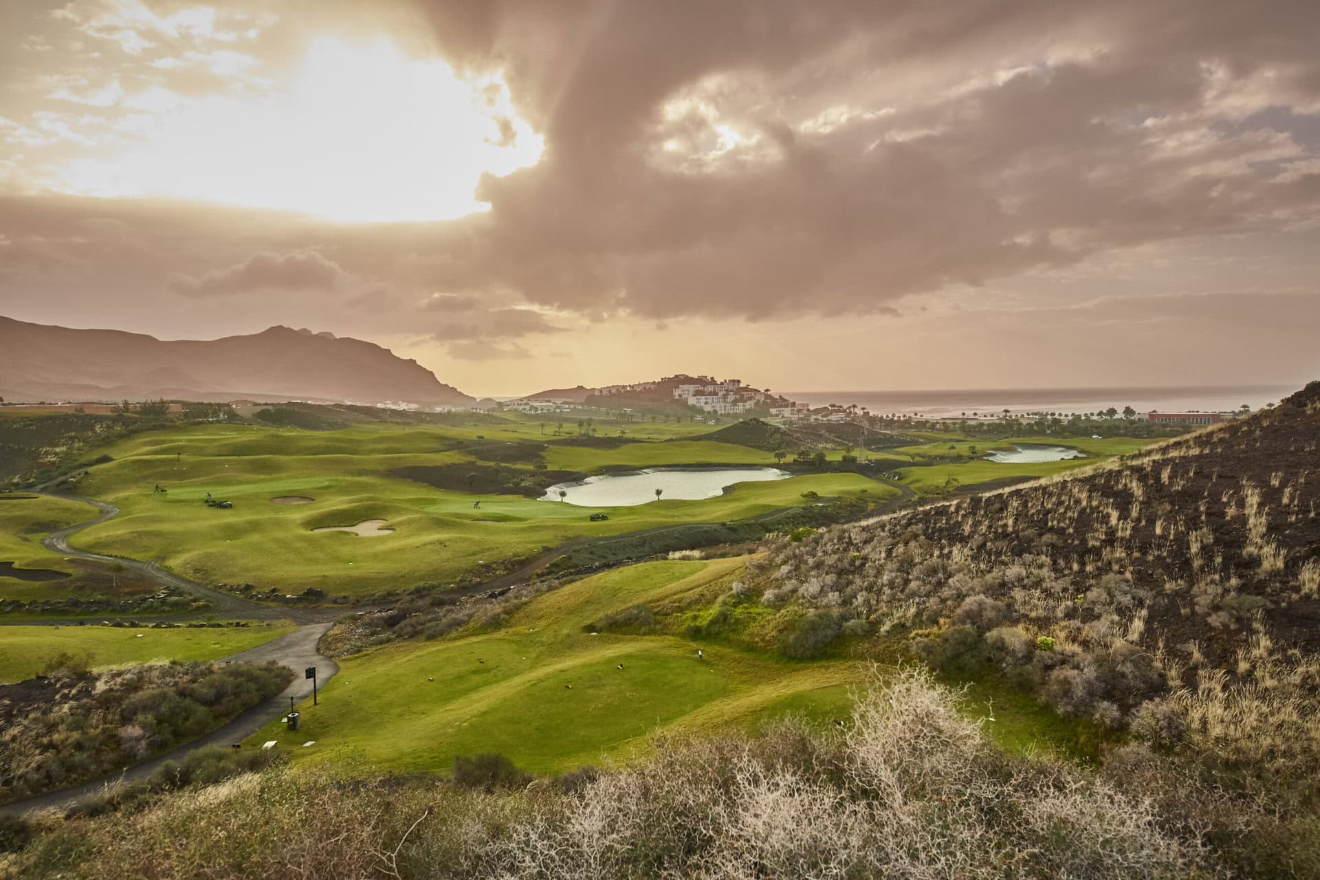 Der Platz hat vier Seen einen einmaligen Kontrast zur rotbraunen Vulkanlandschaft der Insel. Eingebettet zwischen zwei Hügelketten bietet der mit 67-Par ein anspruchsvolles Spiel mit faszinierendem Blick auf den Atlantik